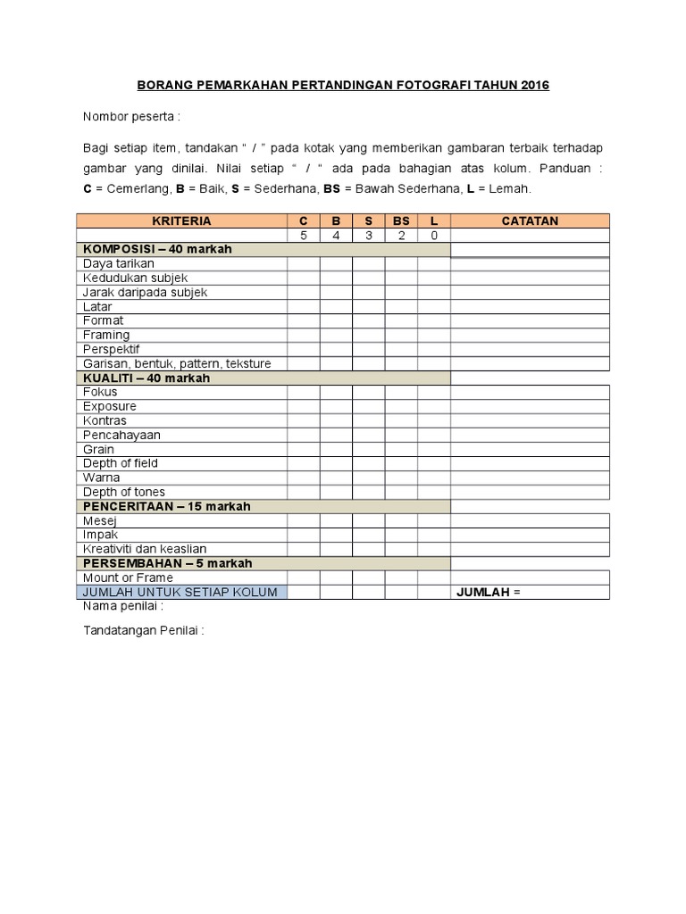 Borang Pemarkahan Pertandingan Fotografi Tahun 2016 Pdf